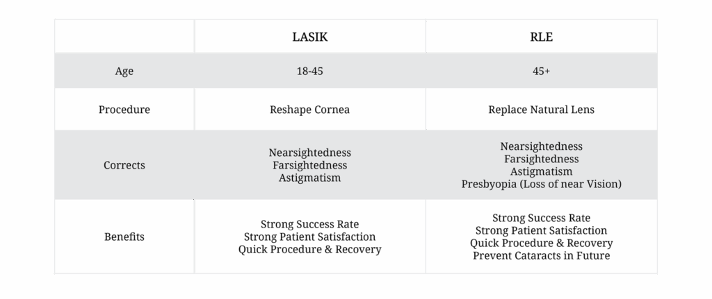 Over time, the natural lens loses flexibility and clarity, leading to difficulty reading, glare at night, and reliance on multiple prescriptions. By replacing this aging lens, RLE corrects vision at its source rather than compensating with glasses. The procedure is similar to cataract surgery, but performed before a cataract develops, allowing patients to improve vision now instead of waiting for vision to worsen.